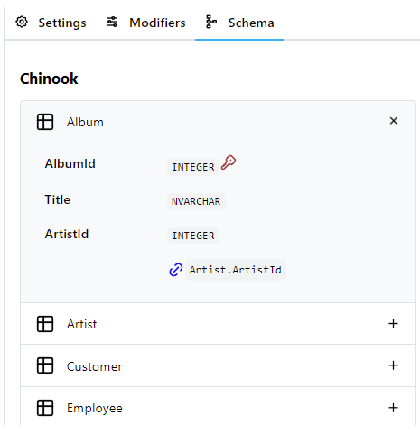 The schema view shows column names and data types, and highlights primary and foreign keys.