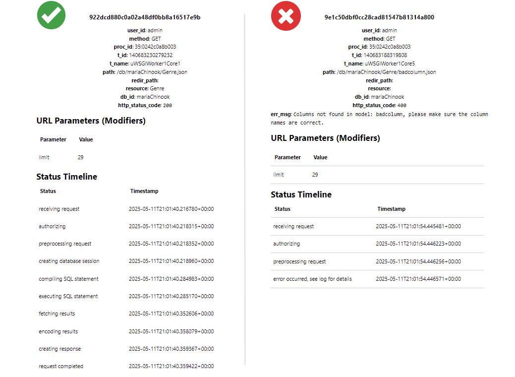 Below are two request details panes; on the left a successful request, on the right a failed request: