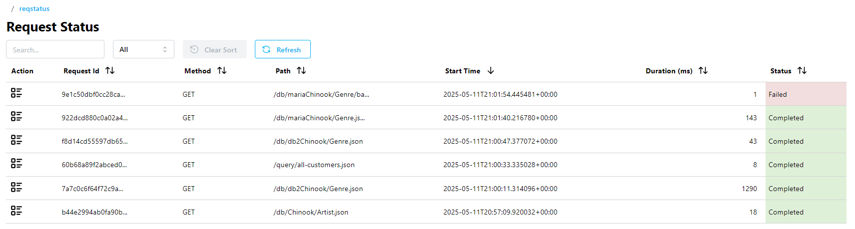 This screen displays information about the status of Data Discovery and SQL Pass-thru requests made by clients. It is accessible from the main menu (Request Status) or from the URL /reqstatus