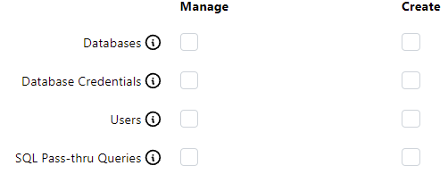 These settings control user access to lists for: Database Connections, Users, SQL Pass-thru Queries, and [Database Credentials].