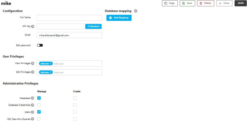 This screen contains a form with account configuration fields, in four sections - Configuration, User Privileges, Administrative Privileges, and Database Mapping.