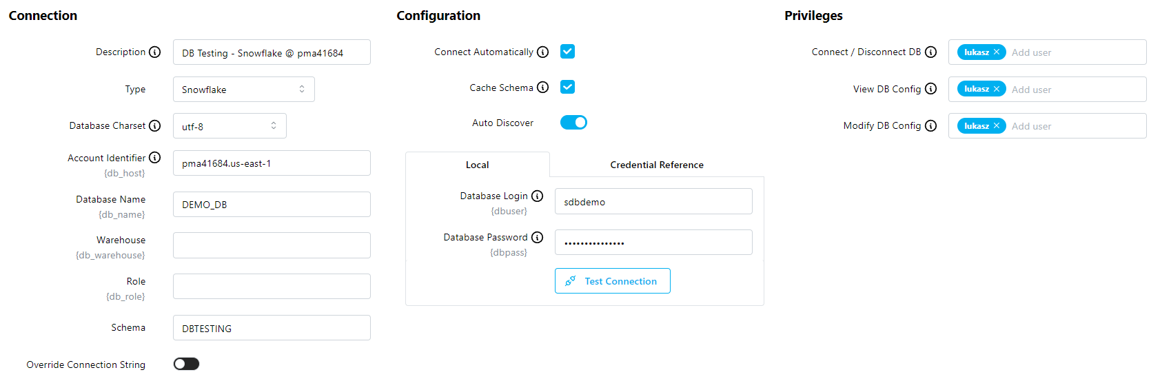 The edit form is divided into three sections: Connection, Configuration, Privileges
