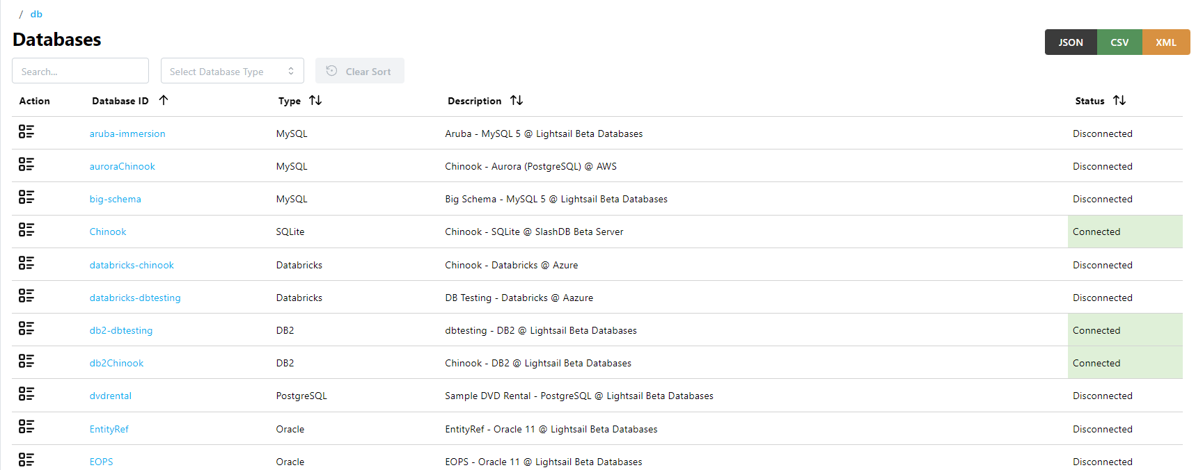 The Data Discovery top-level page provides a list of all the databases that may be accessed by the browser or via REST API. It can be accessed at the /db